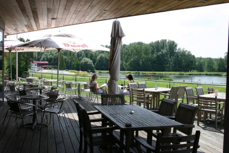 Bistro The Boathouse kan men ons aan het werk zien, met op de achtergrond het BLOSO watersportdomein Hazewinkel.